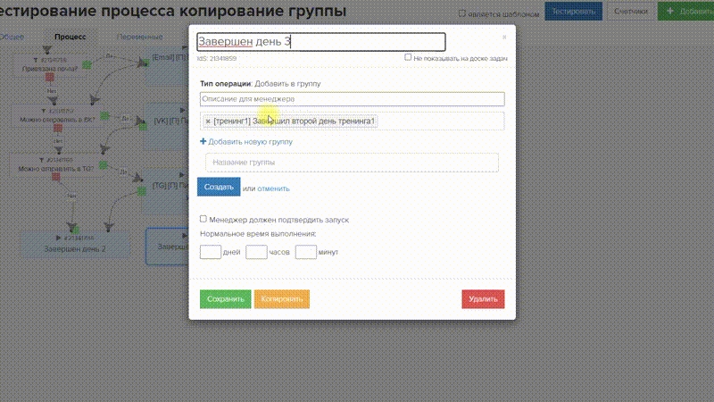Позволяет одним кликом скопировать название группы. Полезно для быстрого создания новой группы с похожим названием, экономит время.