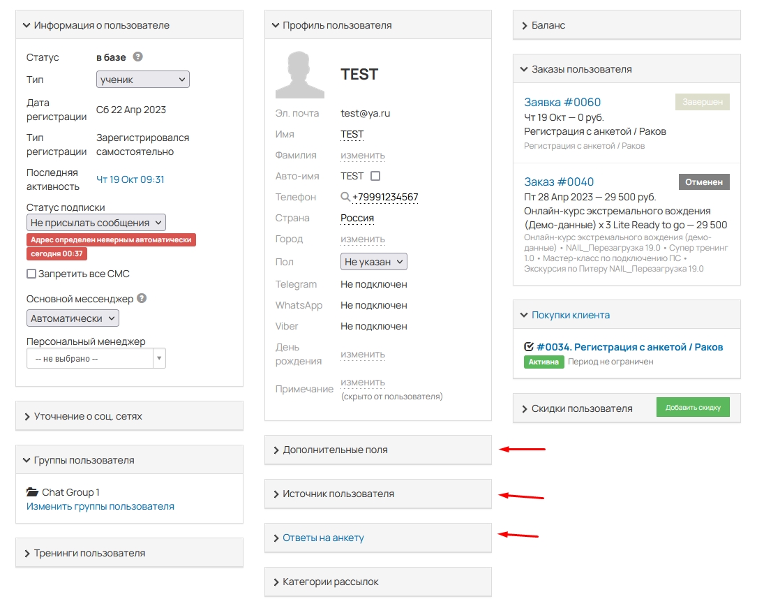 Позволяет свернуть ненужные или развернуть блоки в карточке пользователя и заказа.
