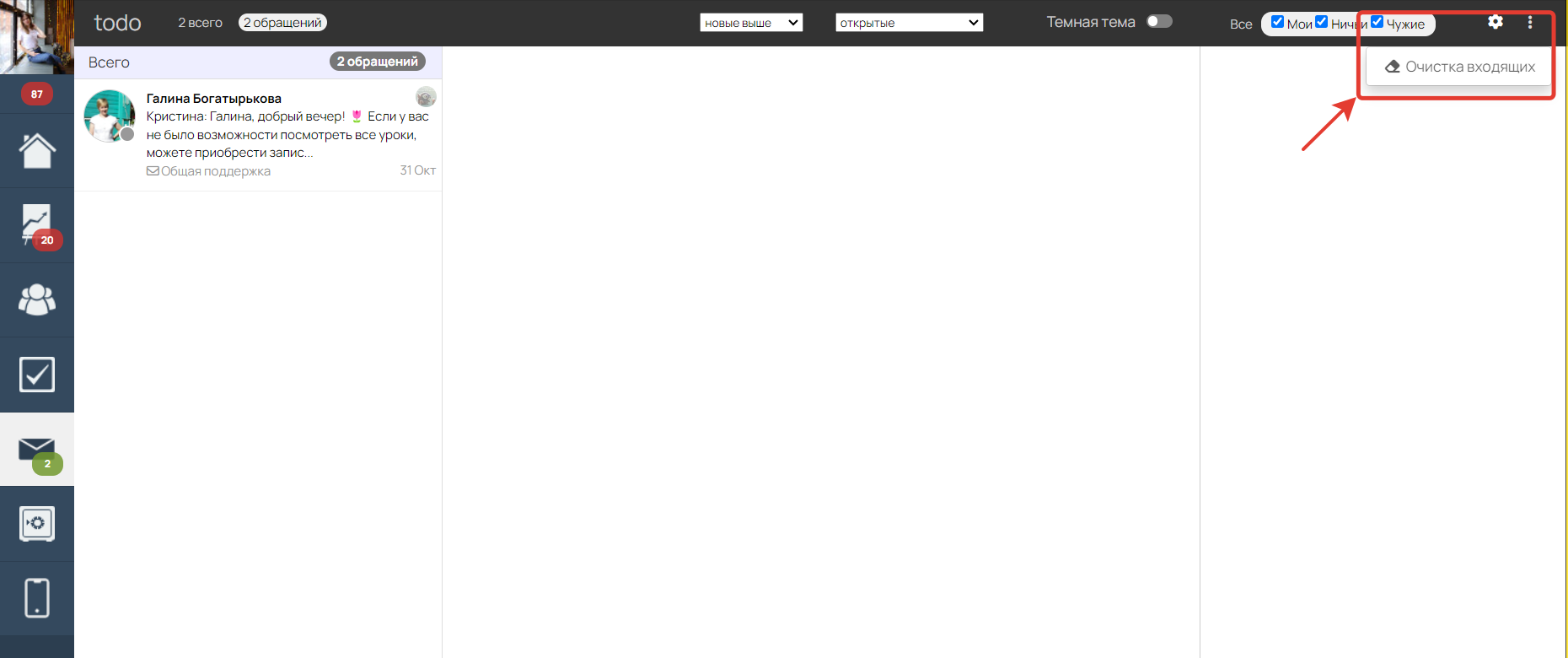 С удалением входящих сообщений из тех.поддержки все аналогично, но времени потребуется гораздо больше. Для использования необходимо перейти во входящие сообщения и нажать 3 точки в правом верхнем углу - далее пункт "Очистка входящих"