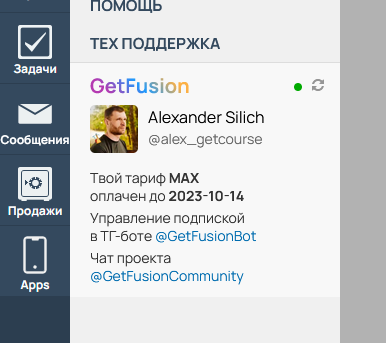 При подключенном к Геткурсу плагине в меню Профиль появляется информационная панель GetFusion, которая видна только администраторам аккаунта.