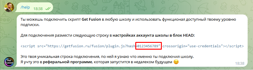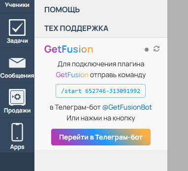 Первым делом переходим в Телеграм-бот @GetFusionBot и активируем бота кнопкой СТАРТ. После этого бот пришлет строку для подключения плагина в GetCourse.